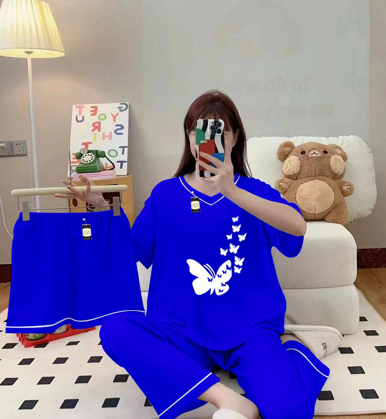 3-Piece Cami Nightwear Set for Women with Elegant White Borders Sky Blue Flying Butterfly Heart