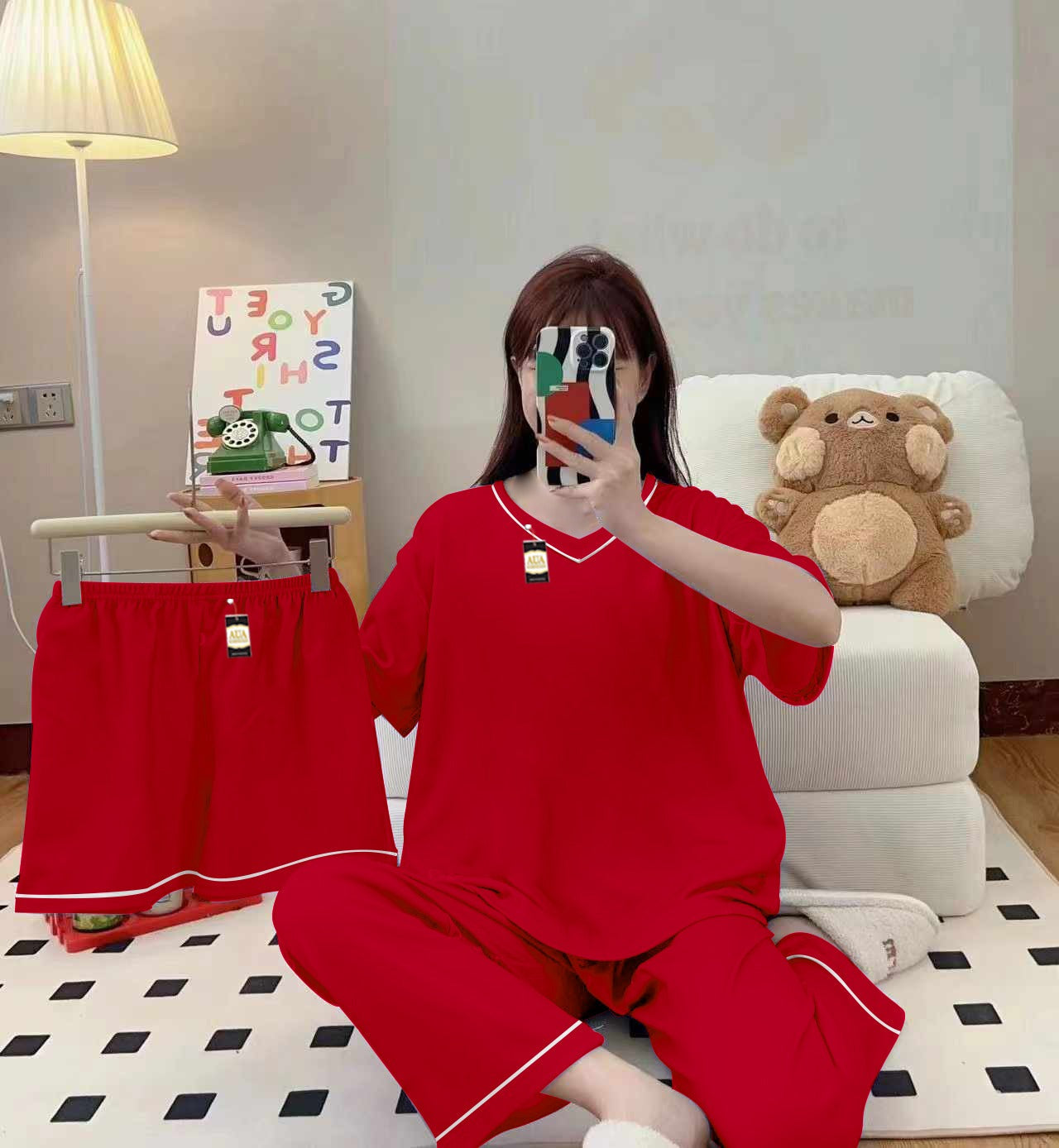 Plan Red 3-Piece Cami Nightwear Set for Women with Elegant White Borders